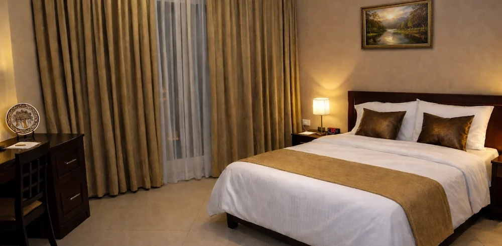 A comfortable room with a simple design inspired by the relaxed feel of Madaba’s Old City. The room includes free Wi-Fi, AC, a flat-screen TV with satellite channels, a wardrobe, a mini fridge, safe, and a kettle with complimentary water, tea, coffee, and herbs to enjoy during your stay.
